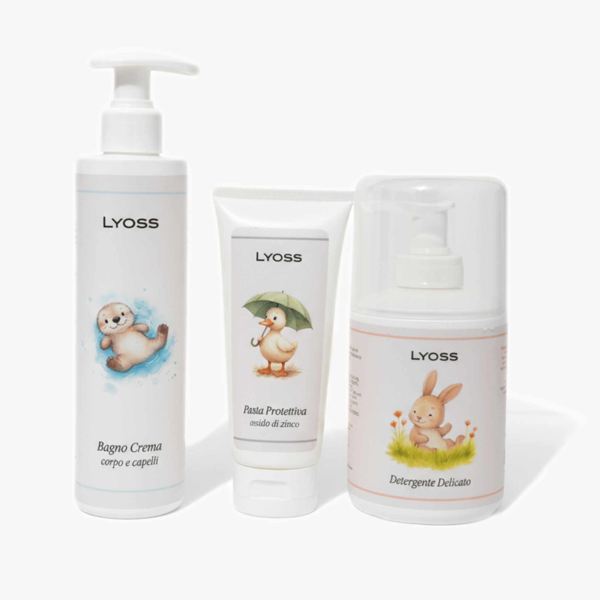 Il Kit Baby Lyoss racchiude i tre prodotti essenziali per prendersi cura con delicatezza e amore della pelle del neonato e del bambino:
